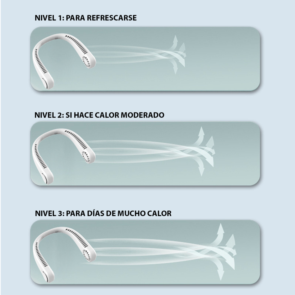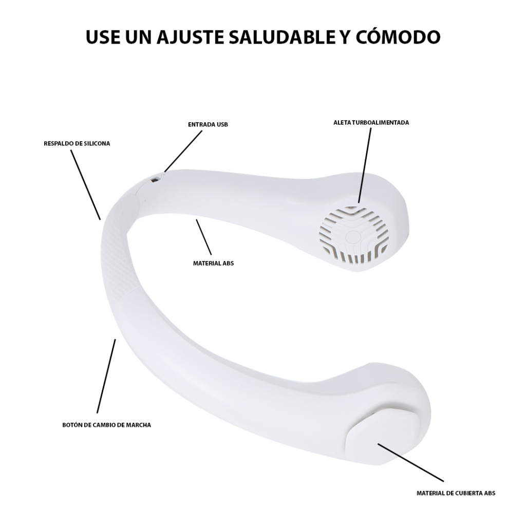 No permitas que el Calor te detenga. Nuestro Ventilador Personal Portatil para el Cuello Recargable te brinda una solución Refrescante y conveniente para los Dias Calurosos. Con solo colocarlo alrededor de tu Cuello, sentirás un agradable Flujo de Aire en tu Rostro y Nuca. Su diseño ligero y ergonómico garantiza una comodidad duradera, y gracias a su Bateria Recargable, no tendrás que preocuparte por las pilas. Disfruta de una sensación refrescante y Manos Libres en cualquier momento y lugar con nuestro ventilador personal portátil para el Cuello Recargable.